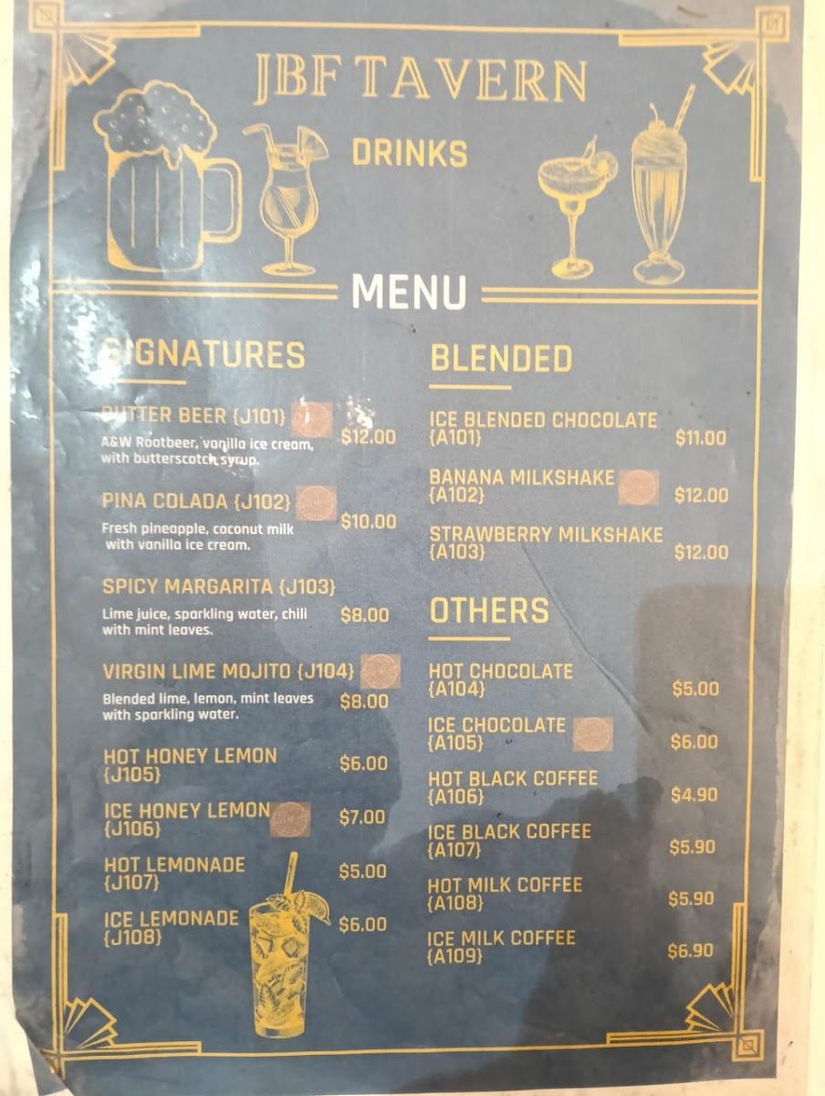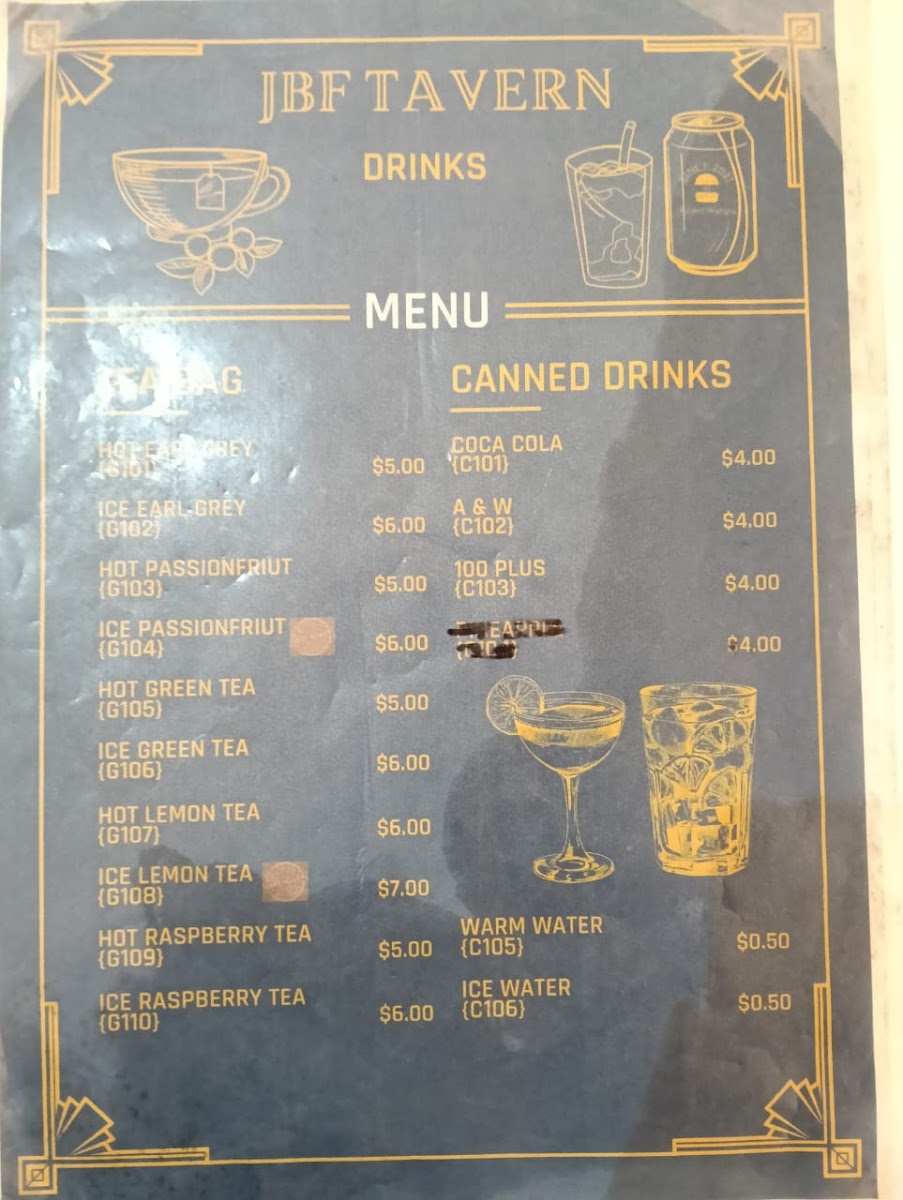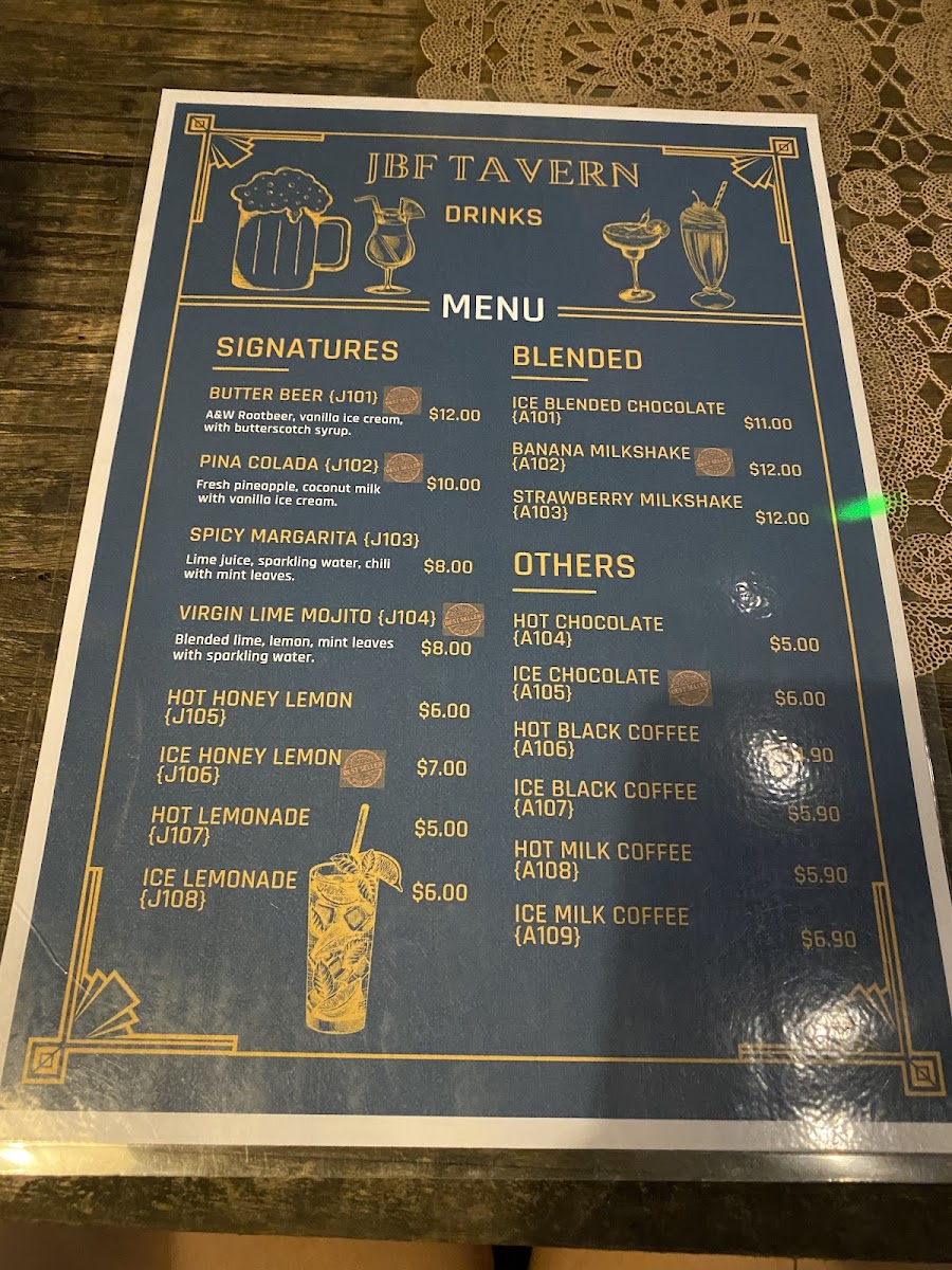 The menu at JBF Tavern features a variety of food and drink options suitable for casual dining. Visitors can choose from a selection of main dishes that include different styles of burgers, such as the Classic Beef Burger and Lolita Burger, as well as other hearty options like beef platters, lamb chops, chicken chop, and fish and chips. There are also several cheese-based dishes including macaroni and cheese and a noodle with cheese quesadilla.