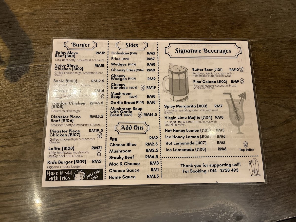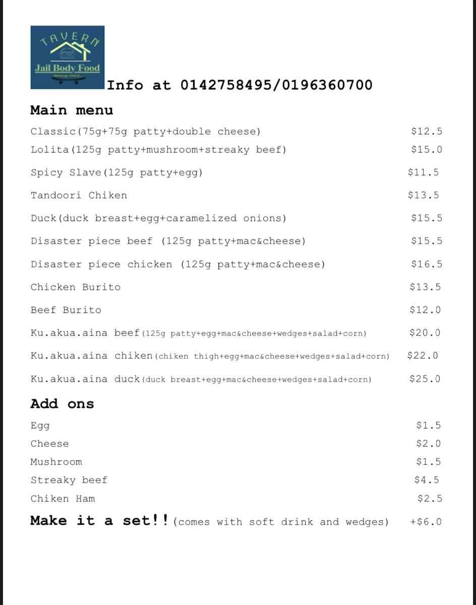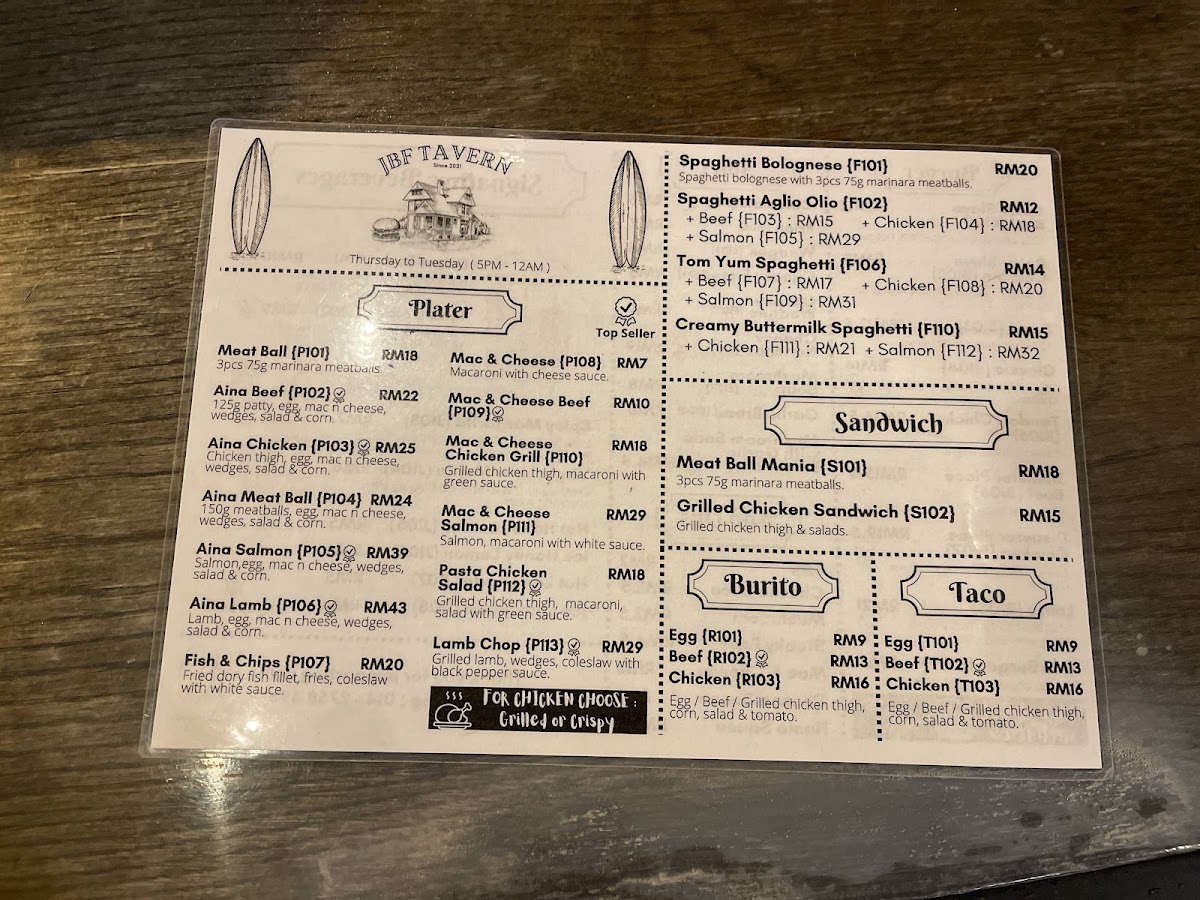 The menu at JBF Tavern features a variety of food and drink options suitable for casual dining. Visitors can choose from a selection of main dishes that include different styles of burgers, such as the Classic Beef Burger and Lolita Burger, as well as other hearty options like beef platters, lamb chops, chicken chop, and fish and chips. There are also several cheese-based dishes including macaroni and cheese and a noodle with cheese quesadilla.
